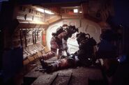 These suits are used by the Nostromo's crew to work and survive in low-pressure environments. The suits consist of at least three variants, the brown and yellow colored suits which both are used for exploration, while the completely white-colored suits are used for emergency situations.